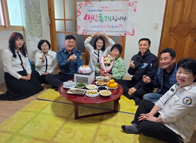 또한 관산읍 파출소(소장 한승국)와 방범대원들은 어르신 가정을 방문해 생일 케이크 촛불을 밝히고 축하 노래를 함께 부르며 건강과 장수를 기원하는 시간을 가졌다.