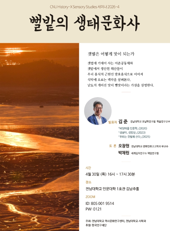 이번 세미나는 역사문화연구센터가 운영하는 'CNU History-X · Sensory Studies(역사 탐구와 감각학)' 시리즈의 2026년 네 번째 자리다.
