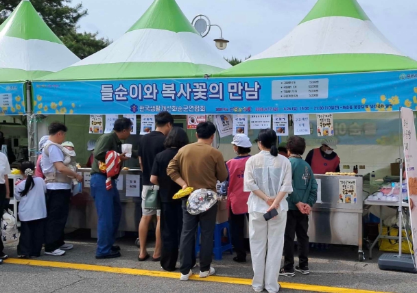 ![]() 2026 화순 봄꽃 축제 현장에서 ‘들순이 국화빵’과 ‘복사꽃빵’을 홍보·판매 중인 한국생활개선화순군연합회 회원들 모습 |
