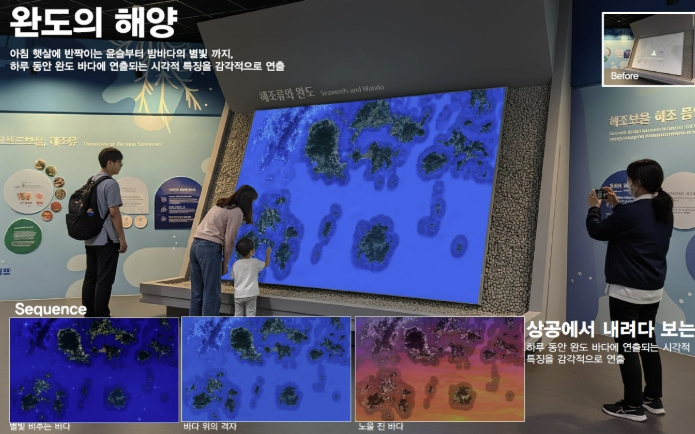 다음 ‘기후 리더, 해조류’는 기후변화로 위협받는 세계 해양과 대비되는 건강한 완도 바다를 대형 영상으로 나타내 인간과 바다의 공존, 미래 해양 환경의 가치를 전달한다.