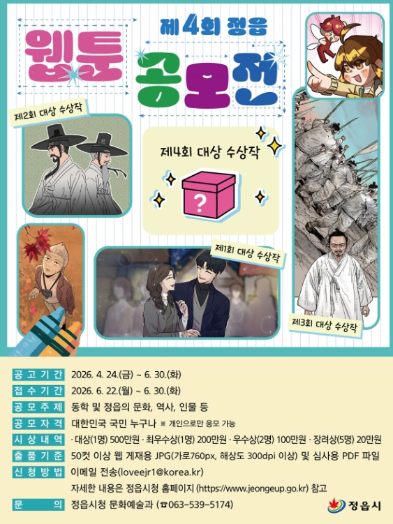 ![]() 정읍시, 제4회 웹툰 공모전 작품 모집 |