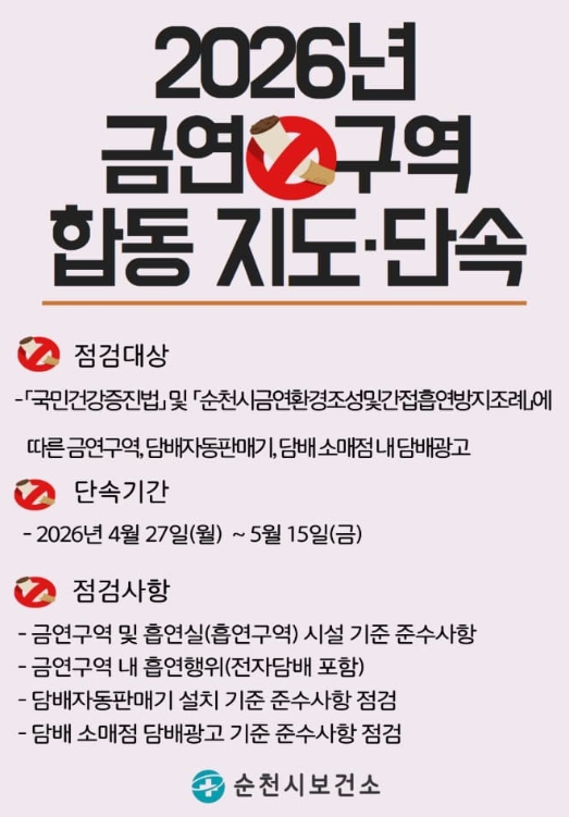 순천시보건소 관계자는 “금연환경 조성을 위해 금연구역 관리 실태를 지속적으로 점검해 나갈 계획이다”며 “시민들께서도 금연문화 정착에 적극 협조해 주시길 바란다”고 말했다.