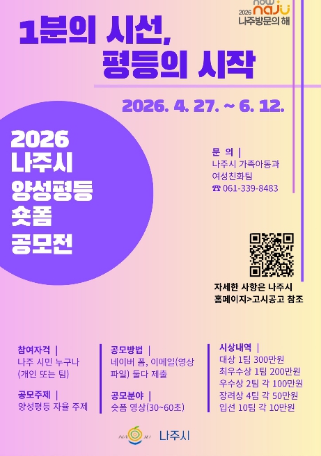 ![]() 나주시가 오는 6월 12일까지 ‘1분의 시선, 평등의 시작’을 주제로 양성평등 숏폼 공모전을 진행한다.(사진 제공-나주시) |