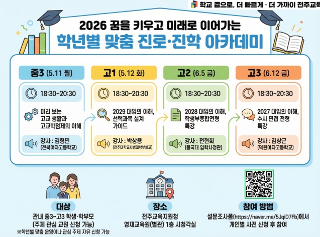 전주교육지원청은 오는 5월 11일부터 6월 12일까지 전주교육지원청 영재교육원 시청각실에서 중3~고3 학생과 학부모를 대상으로 ‘2026년 꿈을 키우고 미래로 이어가는 학년별 맞춤 진로·진학 아카데미’를 운영한다고 28일 밝혔다.