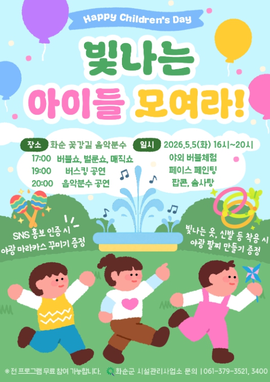 윤재관 홍보소통담당관은 “어린이날을 맞아 아이들이 마음껏 뛰놀고 웃을 수 있는 하루가 되길 바란다”라며, “어린이날 축제에 남녀노소 전 세대가 함께하길 기대한다”라고 밝혔다.