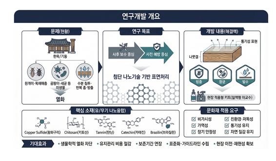 이번 과제는 2026년 4월부터 33개월간 총 17억 8천만 원 규모로 추진되며, 흰개미·곰팡이·습기 등 기후변화로 증가하는 복합 열화 요인에 대응할 수 있는 차세대 친환경 목재 보호기술 개발을 목표로 한다.