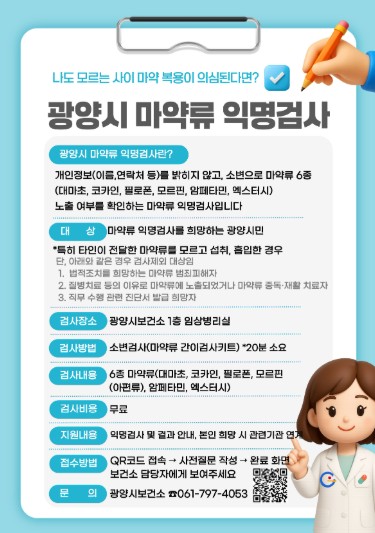 ![]() 광양시보건소, 마약류(6종) 무료 익명검사 실시 |