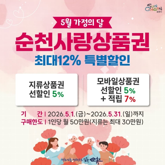 ![]() 순천사랑상품권 5월 특별할인…모바일 최대 12% 혜택 |