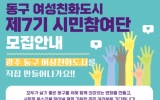 동구 박인석 기자2026. 01.20[AI 호남뉴스]광주 동구는 주민이 직접 참여해 여성친화도시 정책을 만들어가는 ‘제7기 동구 여성친화도시 시민참여단’을 이달 30일까지 모집한다고 밝혔다. 여성친화도시 시민참여단은 행정 주도가 아닌 주민 참여 중심의 정책 협력 조직으로, 생활 현장에서 느끼는 문제를 발굴하고 여성친화 관점에서 개선 방안을 제안하는 역할을 수행한다. 주민의 시선에서 정책을 점검·보완함으로써 체감도 높은 여성친화도시를 조성하는 데 목적이 있다. 제7기 시민참여단은 동구에 주소를 두고 있거나 동구 소재 직장·학교에 다니는 사람을 대상으로 공개 모집...