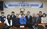 해남 박인석 기자2025. 11.13[뉴스채널]광주 북구의회 정달성 의원(용봉·매곡·삼각·일곡동/더불어민주당)이 13일 이숙희 의원과 함께 ‘장애인친화도시 조성을 위한 정책간담회’를 개최했다. 이번 간담회는 북구 장애인친화도시 조성의 현주소를 점검하고, 현장의 다양한 의견을 바탕으로 민·관·정 차원의 공감대 형성과 실질적인 정책 방향을 모색하기 위해 마련됐다. 이날 간담회에는 정달성·이숙희 의원을 비롯해 오방장애인자립생활센터장, 예그리나장애인센터장, 장애인문화관광센터 사무국장, (사)한국신장장애협회 광주협회 사무처장, 전남대 동아리 ‘내일프로젝트’ 대외협력부장, ...