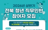 [뉴스채널]전북특별자치도와 전북창조경제혁신센터가 ‘2026년 상반기 전북 청년 직무인턴’ 참여자를 11월 26일까지 모집한다. ‘전북 청년 직무인턴’은 도내 공공기관과 기업에서의 실무형 직무 체험을 통해 청년들의 취업 준비와 진로 탐색을 지원하는 전북 대표 청년 일자리 프로그램이다. 2017년부터 운영해오며 현장 경험 중심의 역량 강화 모델로 자리 잡았다. 올해에는 상하반기 총 433명이 참여했으며, 내년 상반기에는 전북은행, 전북국제협력진흥원, 전북신용보증재단 등 42개 기관·기업에서 215명의 청년이 참여할 예정이다. ...