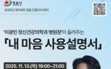 정읍 박인석 기자2025. 11.10[뉴스채널]정읍시는 오는 13일 저녁 7시 연지 아트홀에서 제119회 단풍아카데미를 개최한다. 10일 시에 따르면, 이번 특강은 정신건강의학과 전문의인 이광민 박사를 초청해 현대인의 마음 건강을 주제로 진행된다. 이번 아카데미는 현대사회를 살아가며 마음의 건강을 지키는 법과 스스로의 감정을 이해하는 방법을 함께 나누는 시간으로 마련했다. 특히 서울대 의학박사이자 정신건강의학과 마인드랩 공간 병원장인 이광민 박사가 강사로 나선다. 이 박사는 일상 속 스트레스 관리와 마음 회복의 구체적인 방법을 제시하며 시민들과 소통할 예정...