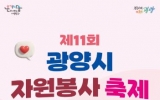 광양 박인석 기자2025. 11.07[뉴스채널]광양시는 오는 11월 15일 성황스포츠센터 다목적체육관에서 광양시자원봉사단체협의회 주관으로 ‘제11회 광양시 자원봉사 축제’를 개최한다고 밝혔다. ‘광양시 자원봉사 축제’는 한 해 동안 지역사회 발전을 위해 헌신한 자원봉사자들을 격려하고, 시민 모두가 함께 나눔의 가치를 공유하는 축제의 장이다. 올해 행사에서는 ▲광양시립합창단 공연 ▲자원봉사 플래시몹 퍼포먼스가 펼쳐지고, 24개의 자원봉사 체험부스가 운영된다. 또한 봉사활동의 성과를 담은 사진전이 열리고, 기념사진을 찍을 수 있는 포토존도 마련돼 자원봉사의 의미를...
