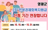 담양 박인석 기자2025. 10.16[뉴스채널]영광군은 전 군민에게 50만 원(2차분)을 지급하는 민생경제회복지원금 신청 기간을 10월 31일까지 2주 더 연장한다. 2차 민생경제회복지원금은 지난 9월 1일부터 10월 15일까지 49,230명에게 246억 원이 지급됐고, 1차 민생경제회복지원금 신청 대비 미신청자가 많은 것으로 나타났다. 이와 관련하여 군은 군민들 중 출타로 인한 부재, 민생회복 소비쿠폰과 신청기간(9. 22.∼10. 31.)을 혼동하여 신청하지 못하는 사례가 있음을 반영하여 지원금을 신청하지 못한 군민들이 혜택을 빠짐없이 받을 수 있도록 신청을 ...