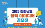 전라남도 박인석 기자2025. 10.04[뉴스채널]전라남도가 새 정부의 실용주의 기조에 맞춰 ‘생활 속 불편을 찾고 이를 개선할, 지역의 미래를 먹여 살릴 정책’을 주제로 ‘2025년 전라남도 정책 아이디어 공모전’을 개최한다. 공모전은 대한민국 국민이라면 누구나 참여할 수 있다. 응모 기간은 오는 21일까지다. 분야는 ▲안전 및 생활불편 ▲신산업 및 일자리 ▲인구 대전환 프로젝트 ▲글로벌 문화·관광 거점 ▲농수축산업 육성, 5개다. 12월 중 자체 심사를 거쳐 우수 제안을 선정, 상장과 함께 시상금을 수여한다. 선정된 아이디어는 민선 8기 전남도정에 적극 반영할...