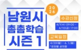 [AI 호남뉴스]남원시는 시민의 다양한 학습 수요를 반영한 ‘2026년 남원시 수시특강 촘촘학습 시즌1’을 오는 4월 20일부터 5월 27일까지 운영한다. 수강신청은 4월 1일 오전 9시부터 4월 10일 오후 5시까지 남원시 통합예약·신청시스템을 통해 선착순으로 진행된다. 촘촘학습 시즌1은 시민의 삶 가까이에서 배움을 지원하는 ‘일상채움 평생교육’과 생각의 폭을 넓히는 ‘사유반짝 평생교육’으로 나누어 운영된다. 생활밀착형 실용 강좌와 인문·사유형 강좌를 균형 있게 구성해 시민들이 취향과 관심에 따라 폭넓게 참여할 수 있도록...