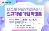 여수 박인석 기자2026. 03.18[AI 호남뉴스]여수시가 오는 3월 31일까지 ‘온라인 설문조사 신규 패널 가입 이벤트’를 실시한다고 밝혔다. 시에 따르면 시정 정책 전반에 시민의 의견 수렴하기 위해 온라인 설문조사를 추진 중이며 ‘온라인 설문조사 패널’에 가입하면 각종 설문조사에 참여할 수 있다. 이벤트 기간은 오는 3월 31일까지이며 여수시민이면 누구나 가입 가능하다. 패널 가입은 이벤트 기간 이후에도 연중 가입할 수 있다. 가입 방법은 아래 QR코드를 통해 접속하거나 여수시 온라인 설문조사 누리집에 접속한 뒤 우측 상단 ‘패널 가입하기’를 클릭해 휴대폰...