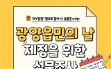 광양 박인석 기자2026. 03.17[AI 호남뉴스] 광양읍민의 날 제정 추진위원회는 ‘광양읍민의 날’ 제정을 위해 오는 3월 17일부터 4월 12일까지 광양읍 주민을 대상으로 설문조사를 실시한다고 밝혔다. 이번 설문조사는 지역의 정체성을 강화하고 읍민 화합과 자긍심을 높이기 위한 ‘광양읍민의 날’ 제정을 추진하는 과정에서 많은 광양읍민들이 공감할 수 있는 의미 있는 날을 정하기 위해 주민 의견을 수렴하고자 마련됐다. 추진위원회는 지난 3월 6일 제1차 회의를 열어 광양읍민의 날 제정 필요성과 후보 일자에 대해 논의했으며, 주민 의견을 반영해 기념일을 정하기 위해...