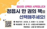 정읍 박인석 기자2026. 03.06[AI 호남뉴스]정읍시가 시민이 함께 읽고 공감하는 독서문화 확산을 위해 2026년 ‘한 권의 책’ 선정을 위한 시민 투표를 오는 22일까지 온·오프라인으로 실시한다. 투표는 정읍시립도서관 누리집을 비롯해 시립도서관 3개소, 작은도서관 13개소, 지역 서점 4곳에서 진행되며 정읍시민이라면 누구나 참여할 수 있다. 참여자는 일반, 청소년, 아동 등 3개 부문별로 각 1권씩 투표하게 된다. 올해 부문별 후보 도서는 총 10권이다. 일반 도서 부문은 인공지능 시대 인간의 역할을 묻는 구본권의 ‘로봇시대, 인간의 일’, ‘완주’를 ...