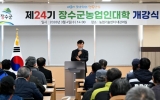 장수 박인석 기자2026. 03.05[AI 호남뉴스]장수군은 4일 농업기술센터 대강의실에서 교육생 80여 명이 참석한 가운데 ‘제24기 장수군 농업인대학’ 개강식을 개최하고 본격적인 교육 운영에 들어갔다. 이날 개강식은 최훈식 장수군수의 격려사를 시작으로 교육 일정과 운영 방향 안내, AI 활용 농업 경영 및 마케팅 특강 순으로 진행됐으며 변화하는 농업 환경에 능동적으로 대응하기 위한 교육의 출발을 알렸다. 올해 농업인대학은 △사과반 △두릅반 △신규농업인 기초영농반 등 3개 과정으로 운영되며 3월부터 11월까지 총 33회, 142시간에 걸쳐 체계적인 교육이 진...