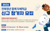 무주 박인석 기자2026. 03.04[AI 호남뉴스]무주군이 오는 16일까지 지역 청년의 생활 안정 기반 조성을 위한 ‘전북청년 함께 두 배 적금’ 참여자 15명을 모집(자세한 내용 무주군청 누리집에서 공지사항 확인)한다. 2년 만기 ‘전북청년 함께 두 배 적금’은 매월 10만 원 납부 시 지자체에서 10만 원을 추가로 적립해 주는 방식으로, 만기 시 본인 저축액의 두 배인 480만 원과 이자를 함께 받을 수 있다. 지원 대상은 공고일 기준 무주군에 거주하며, 최소 5개월 이상 근로(사업자 포함)를 지속 중인 청년으로 기준중위소득 140% 이하인 만 18~39세...