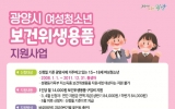 광양 박인석 기자2026. 02.27[AI 호남뉴스]광양시는 여성청소년의 건강권 보장 및 권익 증진을 위해 ‘광양시 여성청소년 보건위생용품 지원사업’을 추진한다고 밝혔다. 지원 대상은 광양시에 주민등록을 두고 거주하는 15세부터 18세(2008년~2011년 출생) 여성청소년으로, 약 2,900명이 혜택을 받을 것으로 예상된다. 지원 금액은 1인당 월 1만 4,000원(연간 최대 16만 8,000원)으로 보건위생용품을 구입할 수 있는 바우처 포인트로 지급되며, 관내 편의점(CU, GS25, 세븐일레븐, 이마트24) 등 오프라인 매장 또는 온라인 ‘푸르미 바우처몰’에...