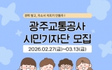 전라북도도 박인석 기자2026. 02.26[AI 호남뉴스]광주교통공사가 광주도시철도의 생생한 현장 소식을 시민의 눈으로 기록하고 전달할 ‘2026 시민소통기자단’을 공개 모집한다. 이번 모집은 도시철도 2호선 건설 현황과 주요 역세권 소식 등 공사의 주요 사업과 현장을 시민의 시각으로 전달하고, 온라인 홍보 콘텐츠를 활성화하기 위해 마련됐다. 선발된 기자단은 약 9개월간 현장 취재를 통해 블로그 포스팅과 SNS 영상 제작 등 다양한 형태의 콘텐츠를 제작하게 된다. 특히 올해는 숏폼 등 영상 콘텐츠 트렌드에 발맞춰 영상 분야(6명)를 새롭게 선발한다. 영상 분야는 개인 ...