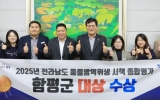 [AI 호남뉴스]전남 함평군이 가축방역 및 축산물 위생 분야에서 3년 연속 우수한 성과를 거두며 뛰어난 행정 역량을 다시 한번 입증했다. 함평군은 11일 “2025년 전라남도 동물방역위생 시책평가에서 대상을 수상했다”고 밝혔다. 앞서 함평군은 같은 평가에서 2023년 대상, 2024년 최우수상에 이어 올해 다시 한번 대상을 차지하는 동물방역위생 선도 지자체로서의 위상을 더욱 공고히 했다. 이번 평가는 전남 22개 시군을 대상으로 방역정책·동물방역·축산물 위생·방역 대응 등 4개 분야로 진행됐다. 함평군은 4개 지표에서 고...