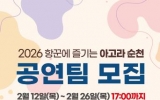 순천 박인석 기자2026. 02.12[AI 호남뉴스](재)순천문화재단은 오는 26일까지 ‘2026 항꾼에 즐기는 아고라 순천’ 문화예술 공연팀을 공개 모집한다고 밝혔다. 올해로 14년째 진행되는 아고라 순천은 그동안 축적해 온 열린 무대경험을 바탕으로 일상에서 시민 누구나 접근 가능한 공공 공연 플랫폼으로 지역 예술인들이 지속적으로 성장할 수 있는 지역 대표 공연 브랜드로 자리매김했다. 이번 공모는 사업 공고일 기준 순천시 거주 예술가(예술단체)로 해당 분야 전공자 등 공연 역량을 갖춘 개인 및 단체라면 지원할 수 있다. 모집 규모는 총 5개 장르 ▲대중음악 ...