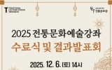 서구 박인석 기자2025. 12.03[AI 호남뉴스]광주문화재단 전통문화관은 오는 12월 6일 오후 2시 전통문화관에서 광주광역시 무형유산 보유자와 수강생이 함께하는 ‘2025 전통문화예술강좌 수료식 및 결과발표회’를 개최한다. 이번 행사는 상·하반기 총 26개 강좌에서 강좌별 15회차 중 70% 이상 출석한 수강생에게 수료증을 수여하고, 무형유산 기·예능 보유자 및 전문강사에게 직접 배운 기량을 선보이기 위해 마련됐다. 수료식은 상·하반기 수강생 수료증 전달식에 이어 1부 기능분야(탱화, 민화, 전통음식) 발표회, 2부 예능분야(판소리, 판소리고법, 가야금병창)...